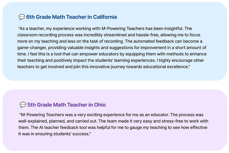 M-Powering Teachers provides a dynamic platform dedicated to enhancing the professional growth and effectiveness of teachers. Through machine learning-based automated feedback on mathematics lessons, personalized support, and continuous improvement research, we aim to empower educators to excel in their practice, inspire lifelong learning, and positively impact student success. Together, we strive to cultivate a thriving ecosystem where teachers can access the tools, knowledge, and connections needed to help each student reach their full potential.