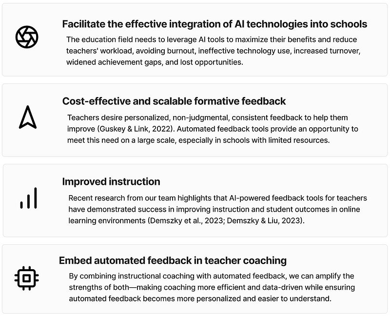 Our team, a group of scholars with expertise in education, linguistics, economics, and computer science, designed a machine learning-based feedback tool called M-Powering Teachers. (M stands for machine.) This tool utilizes natural language processing to analyze verbal classroom interactions and subsequently provides formative feedback to teachers.